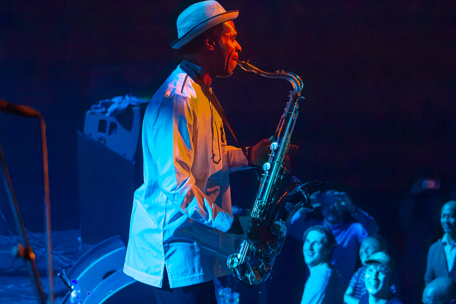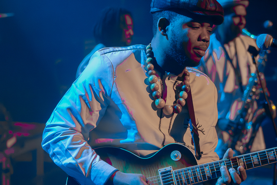 Et puis : le guitariste. René Sowatche, originaire du Bénin mais établi depuis des années sur la scène musicale sénégalaise, s’empare de son rôle principal ce soir à deux mains. Un solo jazzy plein d’arpèges qui s’écoulent les uns dans les autres comme l’huile de palme entre vos doigts. Ce n’est pas de la démonstration. C’est du savoir-faire d’une autre époque, d’une autre culture, apporté dans le sud du Limbourg avec une précision chirurgicale. Sowatche est l’un de ces rares musiciens qui joue aussi facilement l’afrobeat, le highlife et le mbalax, et ce soir il opte pour des runs mélodieux et jazzy qui plongent la salle en transe.