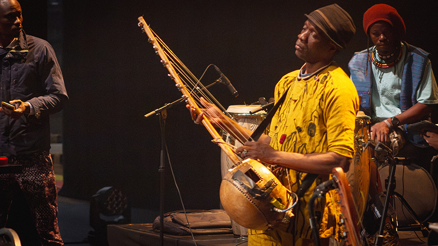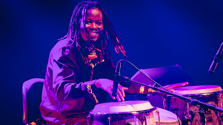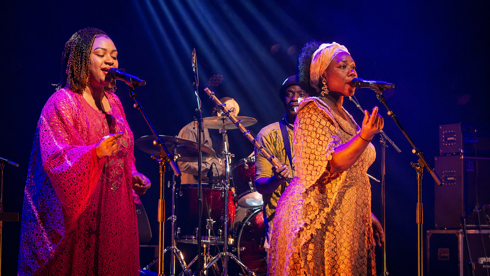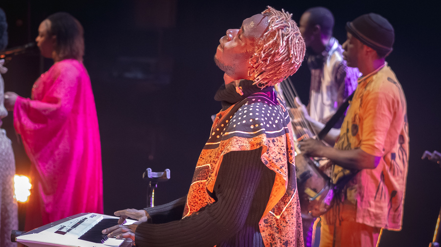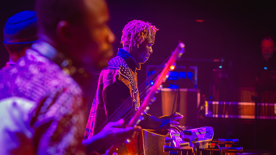 L’Electric Band est conçu pour faire danser. Le directeur musical et guitariste Guimba Tamba, sur une Jaguar légère, naviguait entre blues, mande-funk et stadium rock sans déplacer une épaule. Là où Keita guidait d’un geste, Tamba dirigeait d’un signe de tête, et dans ‘Yamore’ il a surpris avec un solo rock qui donnait au morceau un élan inattendu. ‘Yamore’ est devenu autre chose depuis la mort de Cesária Évora en 2011 : le duo s’est transformé en conversation avec une absente. Que la choriste Aïcha Mariko ait repris le rôle d’Évora à cet endroit, et que cela fonctionne, dit quelque chose du soin avec lequel ce groupe a été assemblé. Mariko et Fatoumata Soubeiga formaient un duo serré et sans esbroufe, mais prenaient en main ‘Tekere’ et ‘Africa’ lorsqu’il fallait soulever la salle — chant mandé dans sa forme la plus pure, ancré dans une tradition dont elles connaissent chaque nuance.